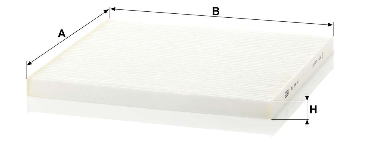 High-quality MANN-FILTER cabin filters offer almost 100% protection against particles such as pollen, diesel soot and tyre abrasion - for a feel-good climate in the vehicle interior and protection of the air conditioning system. Exact fit and perfect tightness ensure constant filtration performance during the entire service interval / Optimum vehicle interior ventilation due to the high air flow capacity.