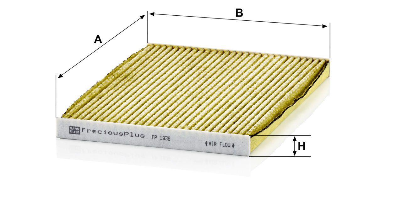 Biofunctional MANN-FILTER FreciousPlus cabin air filters - nearly 100% protection against nitrogen oxides, dust, allergens and mould - harmful gases and unpleasant odours are also eliminated and virus aerosols filtered. The three-layer filter technology absorbs almost 100% of allergens, reduces the growth of molds and bacteria by more than 98% and stops fine dust almost completely.Specification