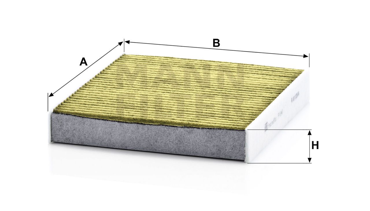 Biofunctional MANN-FILTER FreciousPlus cabin air filters - nearly 100% protection against nitrogen oxides, dust, allergens and mould - harmful gases and unpleasant odours are also eliminated and virus aerosols filtered. The three-layer filter technology absorbs almost 100% of allergens, reduces the growth of molds and bacteria by more than 98% and stops fine dust almost completely.Specification