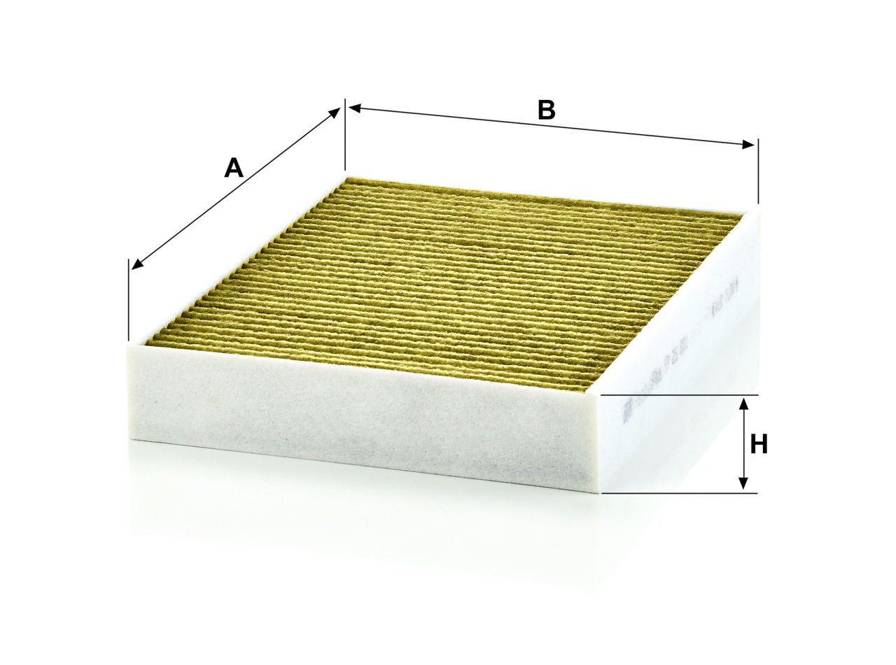 Biofunctional MANN-FILTER FreciousPlus cabin air filters - nearly 100% protection against nitrogen oxides, dust, allergens and mould - harmful gases and unpleasant odours are also eliminated and virus aerosols filtered. The three-layer filter technology absorbs almost 100% of allergens, reduces the growth of molds and bacteria by more than 98% and stops fine dust almost completely.Specification
