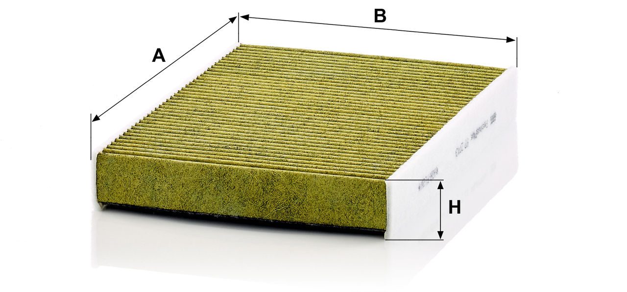 Biofunctional MANN-FILTER FreciousPlus cabin air filters - nearly 100% protection against nitrogen oxides, dust, allergens and mould - harmful gases and unpleasant odours are also eliminated and virus aerosols filtered. The three-layer filter technology absorbs almost 100% of allergens, reduces the growth of molds and bacteria by more than 98% and stops fine dust almost completely.Specification