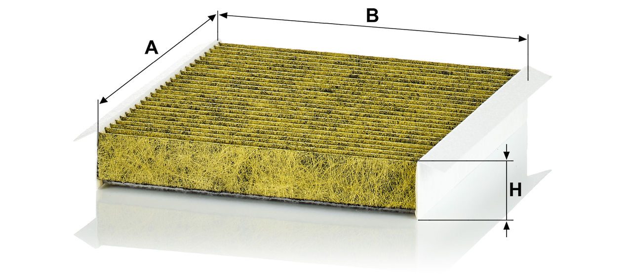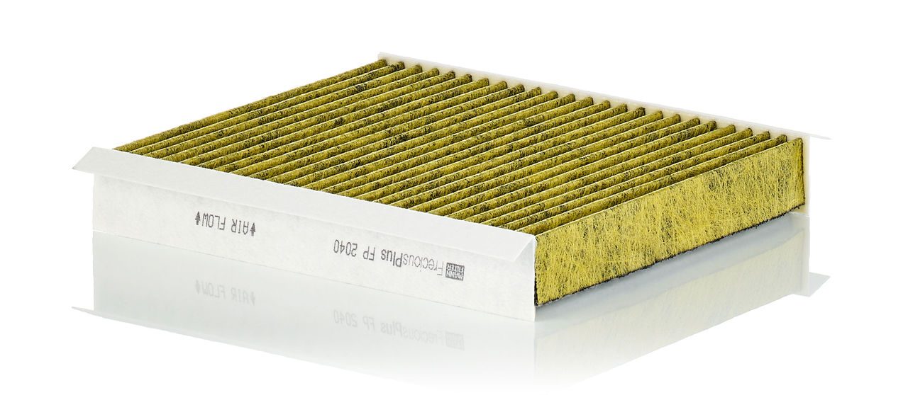 Biofunctional MANN-FILTER FreciousPlus cabin air filters - nearly 100% protection against nitrogen oxides, dust, allergens and mould - harmful gases and unpleasant odours are also eliminated and virus aerosols filtered. The three-layer filter technology absorbs almost 100% of allergens, reduces the growth of molds and bacteria by more than 98% and stops fine dust almost completely.Specification