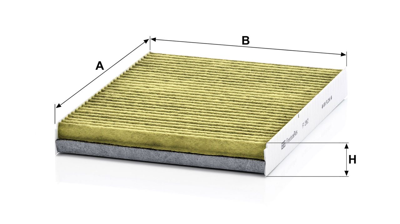 Biofunctional MANN-FILTER FreciousPlus cabin air filters - nearly 100% protection against nitrogen oxides, dust, allergens and mould - harmful gases and unpleasant odours are also eliminated and virus aerosols filtered. The three-layer filter technology absorbs almost 100% of allergens, reduces the growth of molds and bacteria by more than 98% and stops fine dust almost completely.Specification