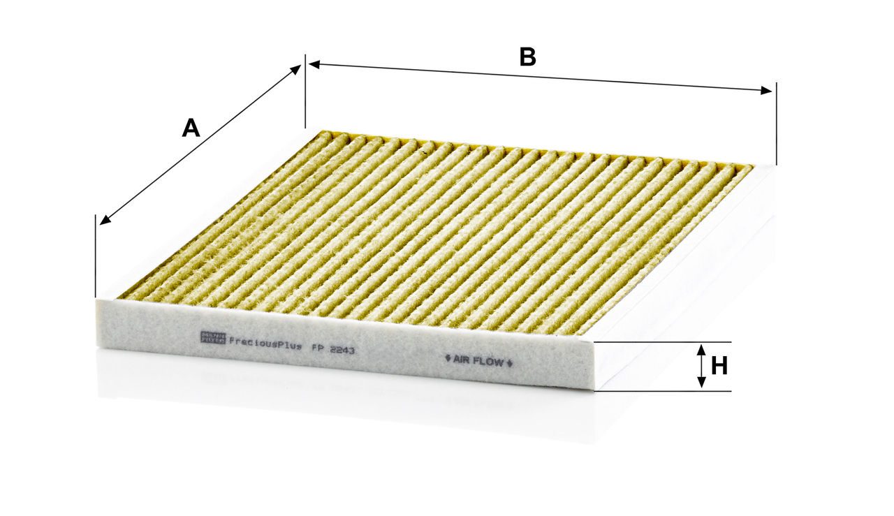 Biofunctional MANN-FILTER FreciousPlus cabin air filters - nearly 100% protection against nitrogen oxides, dust, allergens and mould - harmful gases and unpleasant odours are also eliminated and virus aerosols filtered. The three-layer filter technology absorbs almost 100% of allergens, reduces the growth of molds and bacteria by more than 98% and stops fine dust almost completely.Specification