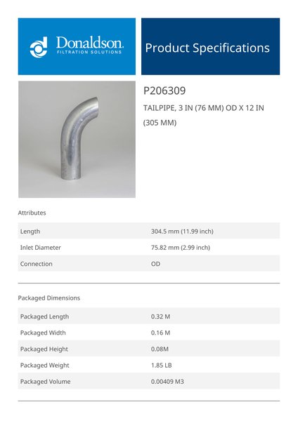 Genuine Donaldson P206309 Tailpipe, 3 In (76 Mm) Od X 12 In (305 Mm) is engineered to deliver reliable performance and durability across a wide range of applications. Designed with high-quality materials, it ensures consistent functionality while meeting demanding operational requirements.
