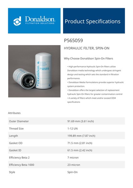 Genuine Donaldson P565059 Hydraulic Filter, Spin-On provides dependable protection for hydraulic systems by efficiently removing particulates and contaminants. It ensures clean hydraulic fluid, promoting smooth operation and extending the lifespan of critical system components.
