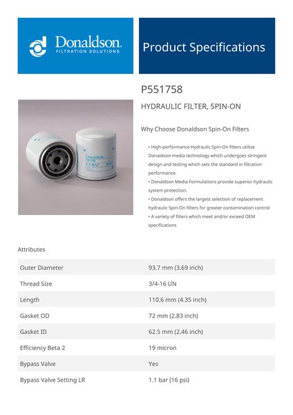 Genuine Donaldson P551758 Hydraulic Filter, Spin-On provides dependable protection for hydraulic systems by efficiently removing particulates and contaminants. It ensures clean hydraulic fluid, promoting smooth operation and extending the lifespan of critical system components.