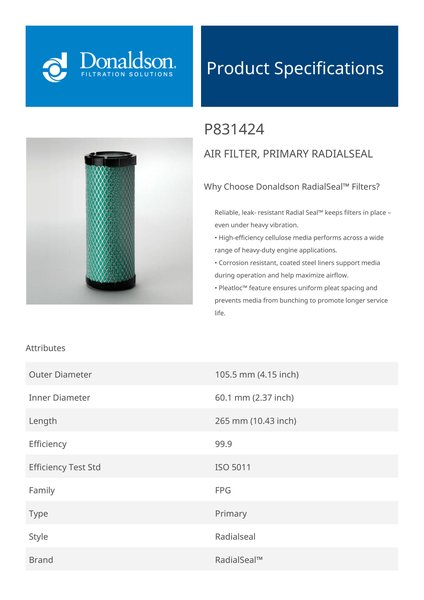 Why Choose Donaldson RadialSeal™ Filters?Reliable, leak- resistant Radial Seal™ keeps filters in place – even under heavy vibration.