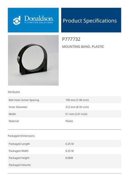 Genuine Donaldson P777732 Mounting Band, Plastic is engineered to deliver reliable performance and durability across a wide range of applications. Designed with high-quality materials, it ensures consistent functionality while meeting demanding operational requirements.