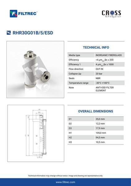 Genuine Filtrec RHR30G01B/5/ESD. This Filtrec element is designed to meet or exceed the quality and performance of brand OEM’s ensuring superior filtration performance and long-lasting durability.Engineered with their high performance media and a durable design, the RHR30G01B/5/ESD provides reliable and consistent performance over its lifespan, even in harsh operating environments. When you order from FilterFinder, you can trust that you are getting a reliable and high-quality replacement filter that will keep your system running smoothly.