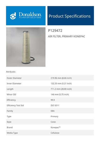 Genuine Donaldson P129472 Air Filter, Primary Konepac is designed to provide reliable performance in air filter, primary konepac applications. Built with high-quality materials, it ensures consistent functionality and durability.