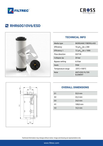 Engineered with their high performance media and a durable design, the RHR60G10V6/ESD provides reliable and consistent performance over its lifespan, even in harsh operating environments. When you order from FilterFinder, you can trust that you are getting a reliable and high-quality replacement filter that will keep your system running smoothly.