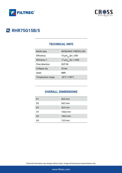 Genuine Filtrec RHR75G15B/5. This Filtrec element is designed to meet or exceed the quality and performance of brand OEM’s ensuring superior filtration performance and long-lasting durability.