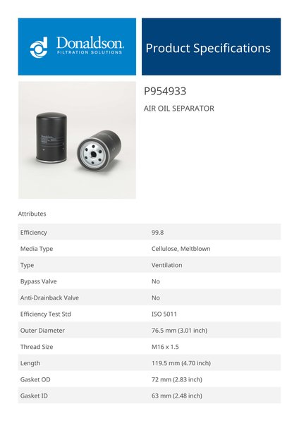 Genuine Donaldson P954933 Air Oil Separator is designed to separate oil from compressed air systems, reducing oil carryover and improving air quality. It enhances system efficiency and protects downstream equipment.
