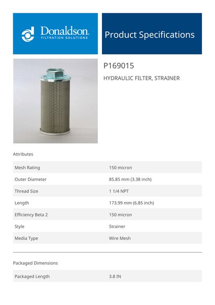 Genuine Donaldson P169015 Hydraulic Filter, Strainer is designed to capture larger contaminants before they enter the hydraulic system, protecting sensitive components from damage. Its coarse filtration capability helps extend the life of downstream filters and improves overall system performance.Ideal for low-pressure applications, this strainer offers durable construction and easy installation. It’s a cost-effective solution for maintaining hydraulic fluid cleanliness and preventing clogging in pumps and valves.