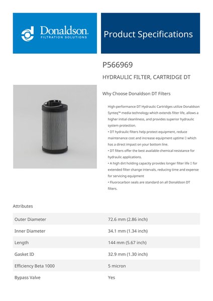 Genuine Donaldson P566969 Hydraulic Filter, Cartridge Dt is engineered with advanced depth filtration technology, offering enhanced dirt retention and fluid cleanliness. It ensures optimal performance in high-pressure hydraulic systems, effectively protecting critical components from wear and extending system life.