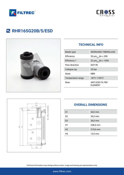 The efficiency of the element is shown using the Micron (µ) and Beta (β) ratings. The micron rating indicates the size of the particle being filtered and the beta rating the efficiency, calculated as 1/β.