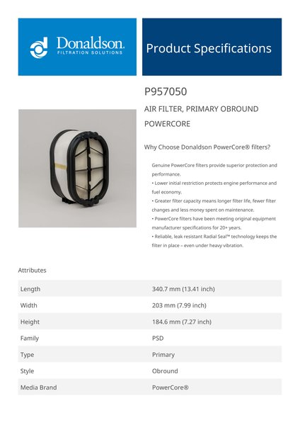 Donaldson P957050 Air Filter, Primary Obround Powercore | Replaces the Gillig 0182758000