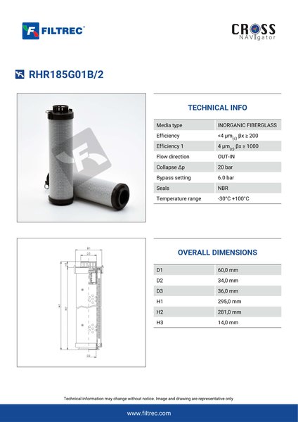 Engineered with their high performance media and a durable design, the RHR185G01B/2 provides reliable and consistent performance over its lifespan, even in harsh operating environments. When you order from FilterFinder, you can trust that you are getting a reliable and high-quality replacement filter that will keep your system running smoothly.