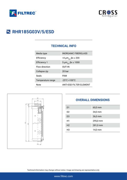 Genuine Filtrec RHR185G03V/5/ESD. This Filtrec element is designed to meet or exceed the quality and performance of brand OEM’s ensuring superior filtration performance and long-lasting durability.Engineered with their high performance media and a durable design, the RHR185G03V/5/ESD provides reliable and consistent performance over its lifespan, even in harsh operating environments. When you order from FilterFinder, you can trust that you are getting a reliable and high-quality replacement filter that will keep your system running smoothly.