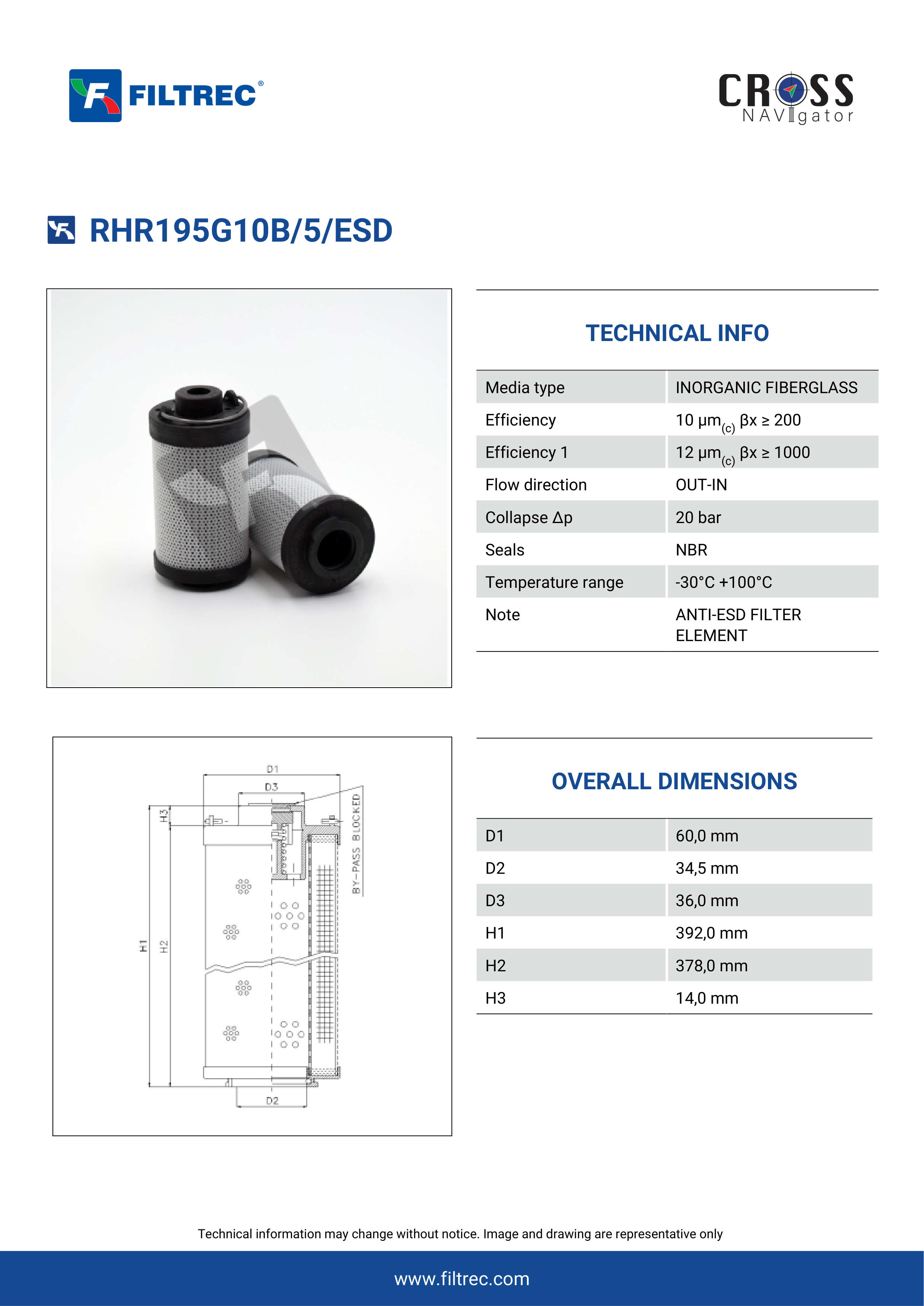Genuine Filtrec RHR195G10B/5/ESD. This Filtrec element is designed to meet or exceed the quality and performance of brand OEM’s ensuring superior filtration performance and long-lasting durability.Engineered with their high performance media and a durable design, the RHR195G10B/5/ESD provides reliable and consistent performance over its lifespan, even in harsh operating environments. When you order from FilterFinder, you can trust that you are getting a reliable and high-quality replacement filter that will keep your system running smoothly.