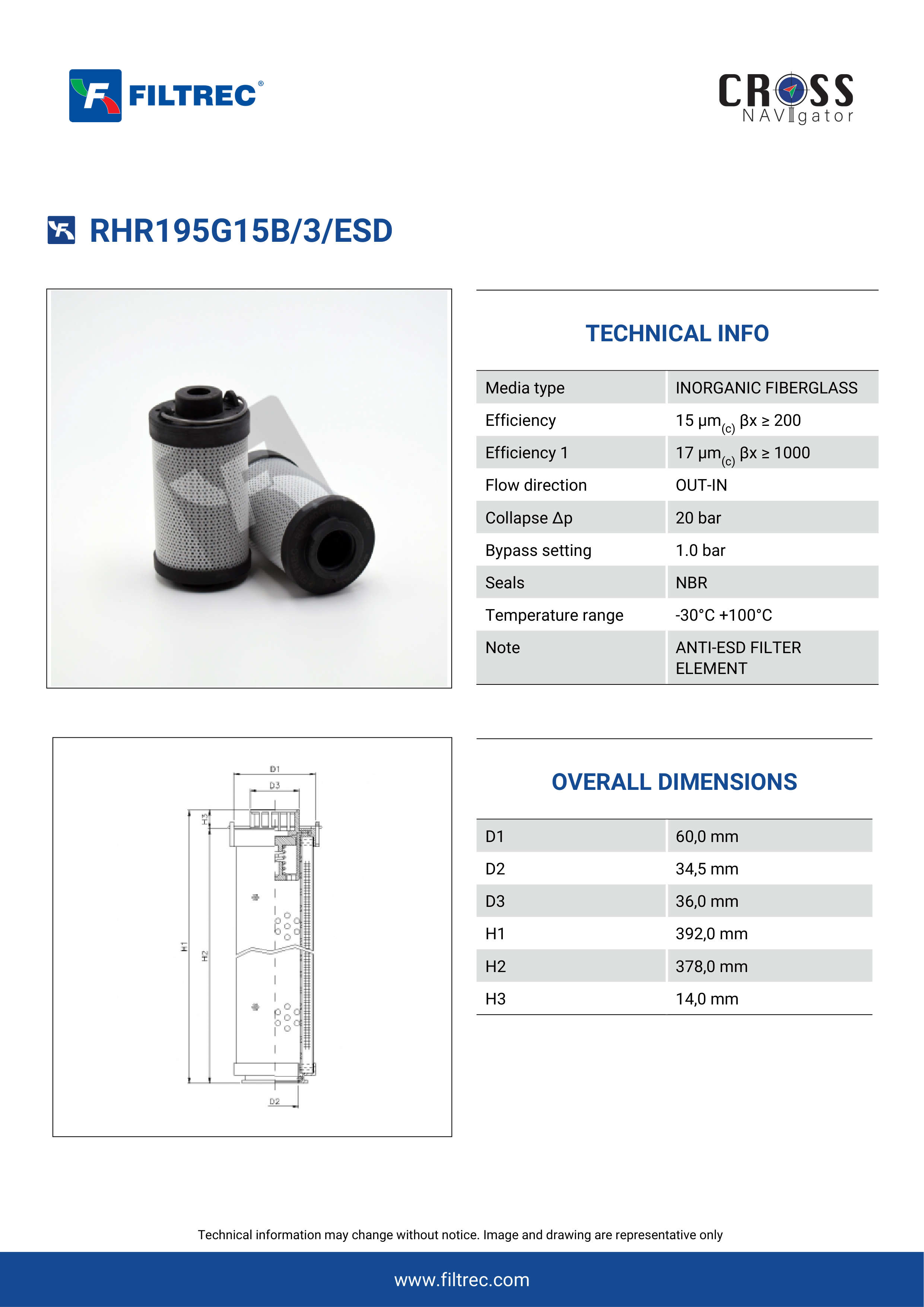 Genuine Filtrec RHR195G15B/3/ESD. This Filtrec element is designed to meet or exceed the quality and performance of brand OEM’s ensuring superior filtration performance and long-lasting durability.Engineered with their high performance media and a durable design, the RHR195G15B/3/ESD provides reliable and consistent performance over its lifespan, even in harsh operating environments. When you order from FilterFinder, you can trust that you are getting a reliable and high-quality replacement filter that will keep your system running smoothly.