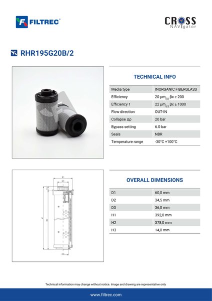 The efficiency of the element is shown using the Micron (µ) and Beta (β) ratings. The micron rating indicates the size of the particle being filtered and the beta rating the efficiency, calculated as 1/β.