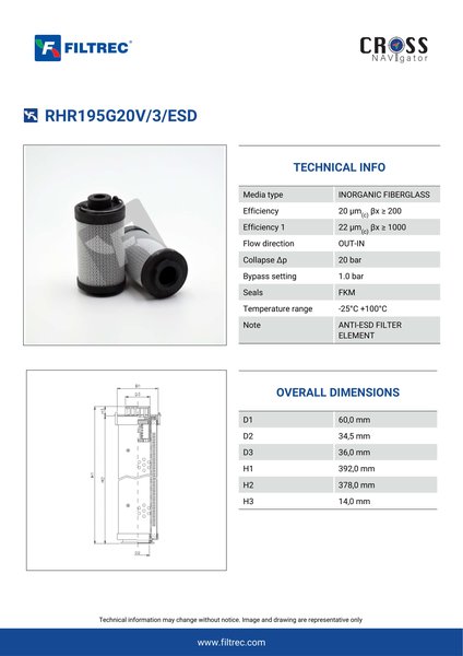 Engineered with their high performance media and a durable design, the RHR195G20V/3/ESD provides reliable and consistent performance over its lifespan, even in harsh operating environments. When you order from FilterFinder, you can trust that you are getting a reliable and high-quality replacement filter that will keep your system running smoothly.