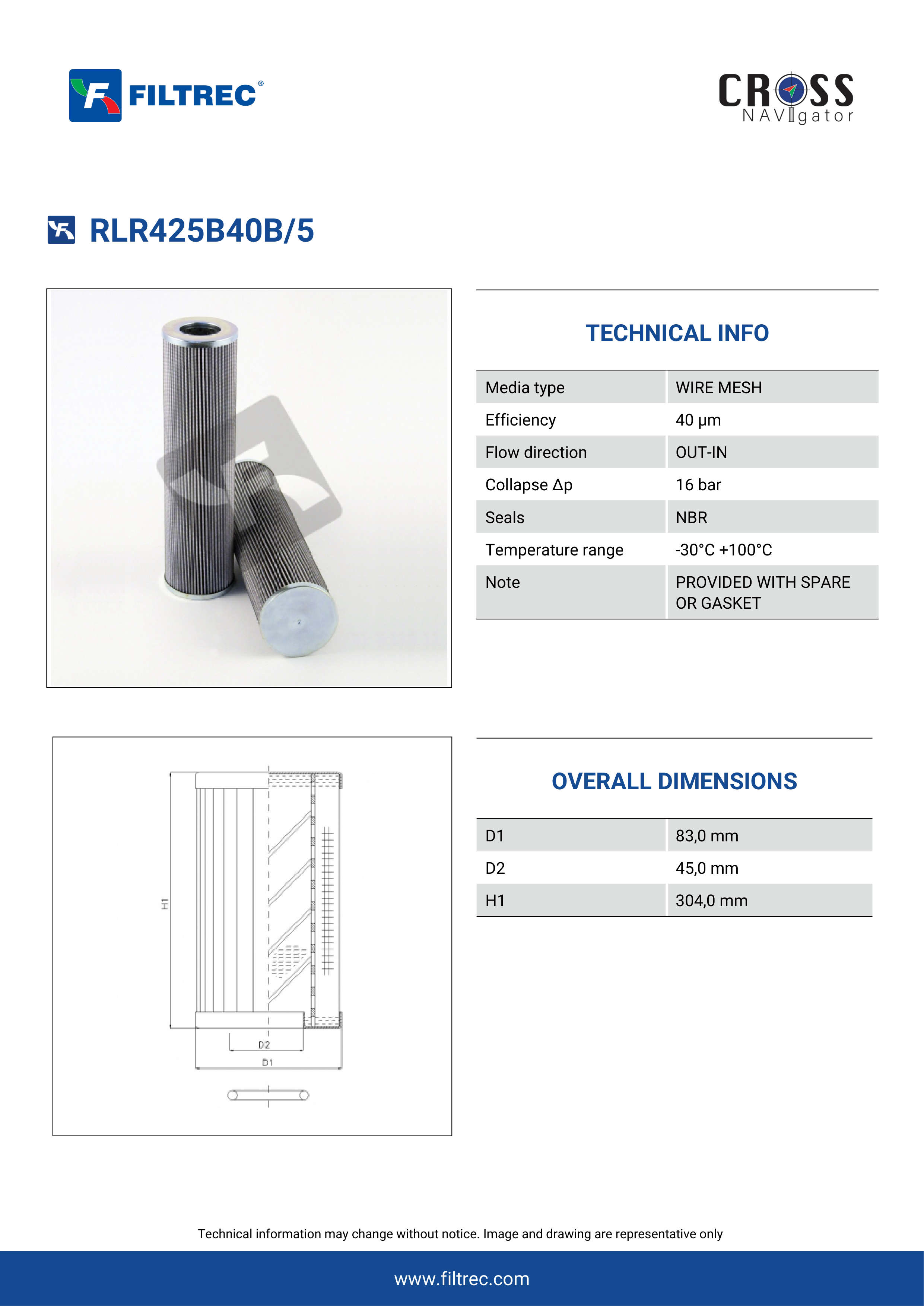 Genuine Filtrec RLR425B40B/5. This Filtrec element is designed to meet or exceed the quality and performance of brand OEM’s ensuring superior filtration performance and long-lasting durability.