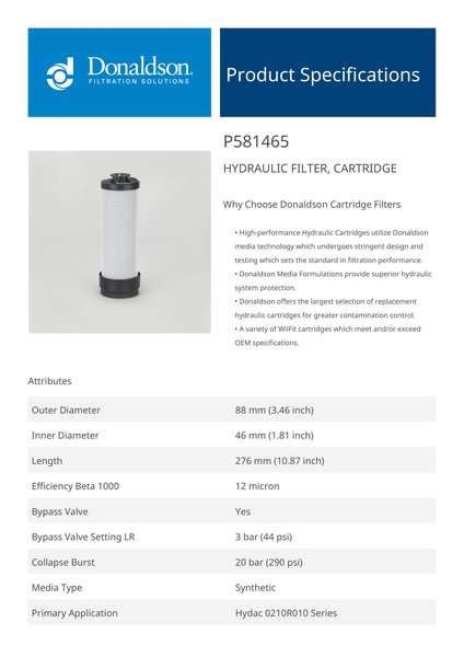 Donaldson P581465 Hydraulic Filter, Cartridge | Replaces the Hydac 0210 R 010 MM