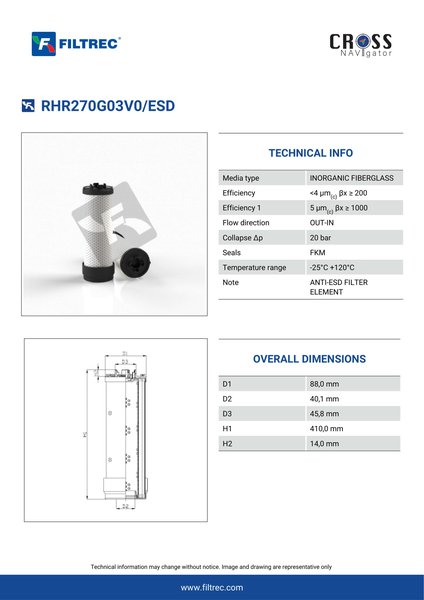 The efficiency of the element is shown using the Micron (µ) and Beta (β) ratings. The micron rating indicates the size of the particle being filtered and the beta rating the efficiency, calculated as 1/β.