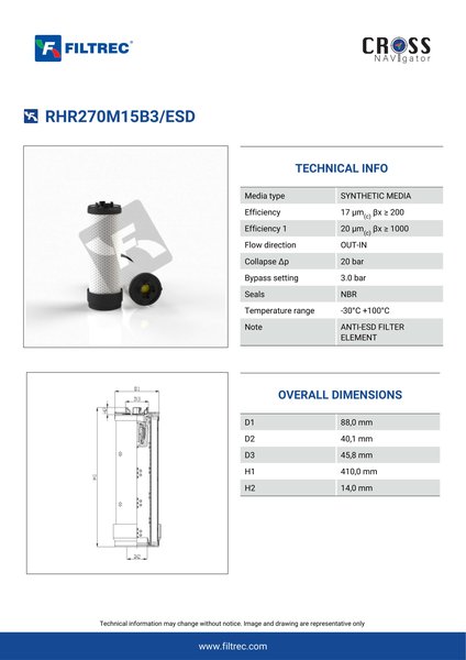 Engineered with their high performance media and a durable design, the RHR270M15B3/ESD provides reliable and consistent performance over its lifespan, even in harsh operating environments. When you order from FilterFinder, you can trust that you are getting a reliable and high-quality replacement filter that will keep your system running smoothly.
