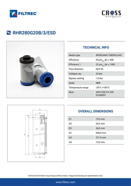 Engineered with their high performance media and a durable design, the RHR280G20B/3/ESD provides reliable and consistent performance over its lifespan, even in harsh operating environments. When you order from FilterFinder, you can trust that you are getting a reliable and high-quality replacement filter that will keep your system running smoothly.