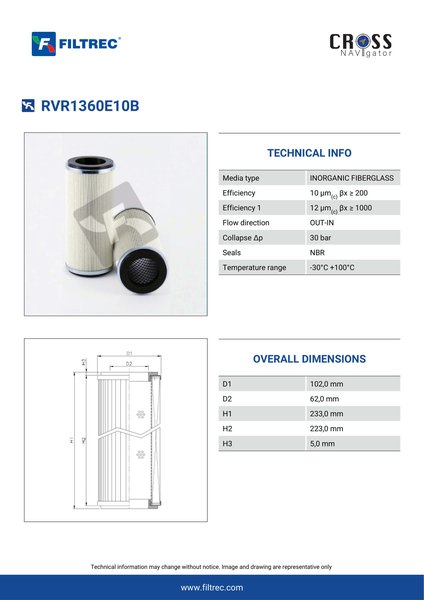 Genuine Filtrec RVR1360E10B. This Filtrec element is designed to meet or exceed the quality and performance of brand OEM’s ensuring superior filtration performance and long-lasting durability.Engineered with their high performance media and a durable design, the RVR1360E10B provides reliable and consistent performance over its lifespan, even in harsh operating environments. When you order from FilterFinder, you can trust that you are getting a reliable and high-quality replacement filter that will keep your system running smoothly.