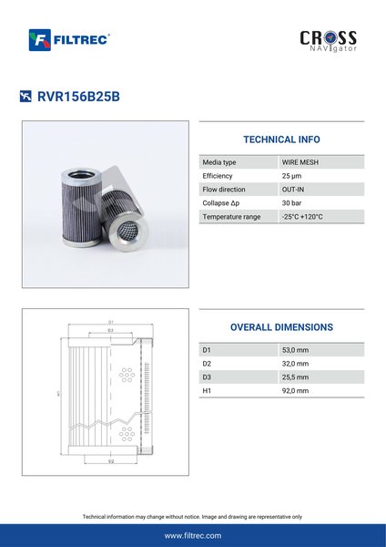 Genuine Filtrec RVR156B25B. This Filtrec element is designed to meet or exceed the quality and performance of brand OEM’s ensuring superior filtration performance and long-lasting durability.