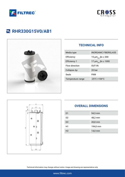 The efficiency of the element is shown using the Micron (µ) and Beta (β) ratings. The micron rating indicates the size of the particle being filtered and the beta rating the efficiency, calculated as 1/β.