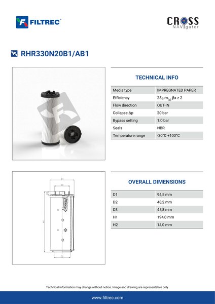 Genuine Filtrec RHR330N20B1/AB1. This Filtrec element is designed to meet or exceed the quality and performance of brand OEM’s ensuring superior filtration performance and long-lasting durability.Engineered with their high performance media and a durable design, the RHR330N20B1/AB1 provides reliable and consistent performance over its lifespan, even in harsh operating environments. When you order from FilterFinder, you can trust that you are getting a reliable and high-quality replacement filter that will keep your system running smoothly.