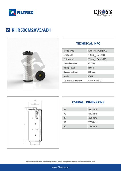 Genuine Filtrec RHR500M20V3/AB1. This Filtrec element is designed to meet or exceed the quality and performance of brand OEM’s ensuring superior filtration performance and long-lasting durability.Engineered with their high performance media and a durable design, the RHR500M20V3/AB1 provides reliable and consistent performance over its lifespan, even in harsh operating environments. When you order from FilterFinder, you can trust that you are getting a reliable and high-quality replacement filter that will keep your system running smoothly.