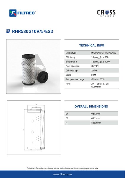 Genuine Filtrec RHR580G10V/5/ESD. This Filtrec element is designed to meet or exceed the quality and performance of brand OEM’s ensuring superior filtration performance and long-lasting durability.Engineered with their high performance media and a durable design, the RHR580G10V/5/ESD provides reliable and consistent performance over its lifespan, even in harsh operating environments. When you order from FilterFinder, you can trust that you are getting a reliable and high-quality replacement filter that will keep your system running smoothly.