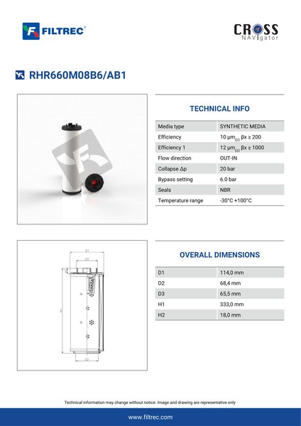 The efficiency of the element is shown using the Micron (µ) and Beta (β) ratings. The micron rating indicates the size of the particle being filtered and the beta rating the efficiency, calculated as 1/β.