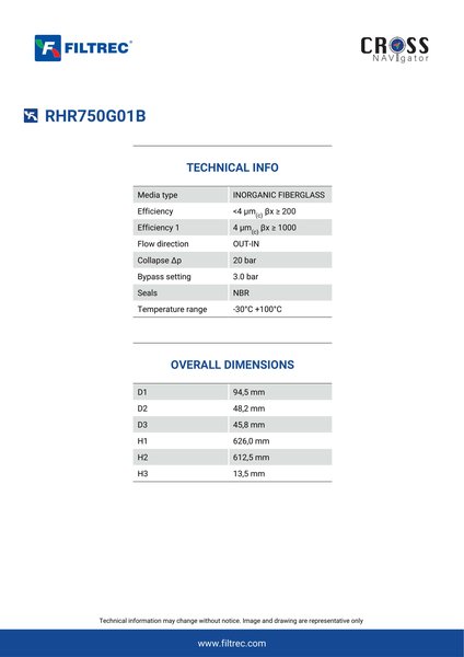 Genuine Filtrec RHR750G01B. This Filtrec element is designed to meet or exceed the quality and performance of brand OEM’s ensuring superior filtration performance and long-lasting durability.