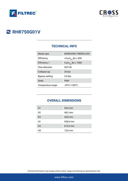 Engineered with their high performance media and a durable design, the RHR750G01V provides reliable and consistent performance over its lifespan, even in harsh operating environments. When you order from FilterFinder, you can trust that you are getting a reliable and high-quality replacement filter that will keep your system running smoothly.