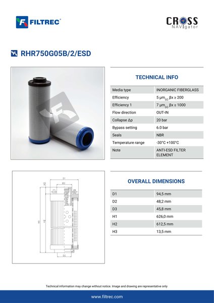 Genuine Filtrec RHR750G05B/2/ESD. This Filtrec element is designed to meet or exceed the quality and performance of brand OEM’s ensuring superior filtration performance and long-lasting durability.Engineered with their high performance media and a durable design, the RHR750G05B/2/ESD provides reliable and consistent performance over its lifespan, even in harsh operating environments. When you order from FilterFinder, you can trust that you are getting a reliable and high-quality replacement filter that will keep your system running smoothly.