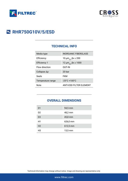 Genuine Filtrec RHR750G10V/5/ESD. This Filtrec element is designed to meet or exceed the quality and performance of brand OEM’s ensuring superior filtration performance and long-lasting durability.
