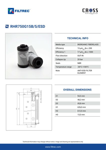 Genuine Filtrec RHR750G15B/5/ESD. This Filtrec element is designed to meet or exceed the quality and performance of brand OEM’s ensuring superior filtration performance and long-lasting durability.Engineered with their high performance media and a durable design, the RHR750G15B/5/ESD provides reliable and consistent performance over its lifespan, even in harsh operating environments. When you order from FilterFinder, you can trust that you are getting a reliable and high-quality replacement filter that will keep your system running smoothly.