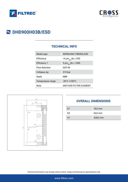 Genuine Filtrec DHD900H03B/ESD. This Filtrec element is designed to meet or exceed the quality and performance of brand OEM’s ensuring superior filtration performance and long-lasting durability.