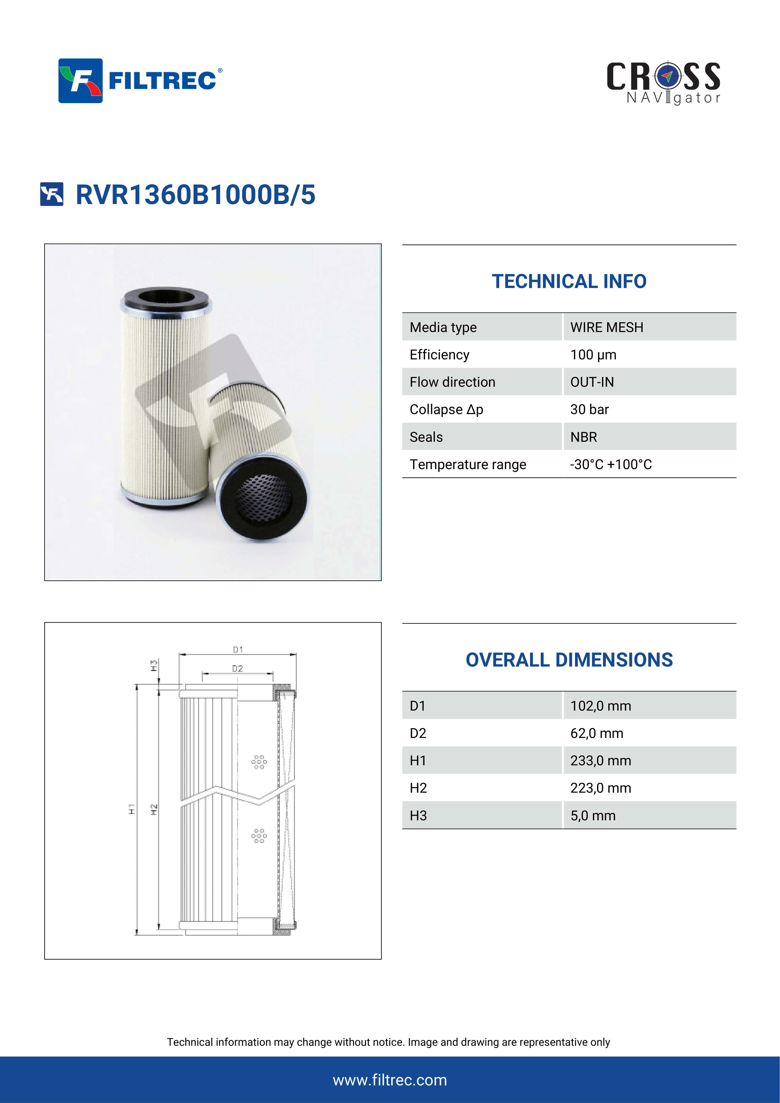 Genuine Filtrec RVR1360B1000B/5. This Filtrec element is designed to meet or exceed the quality and performance of brand OEM’s ensuring superior filtration performance and long-lasting durability.