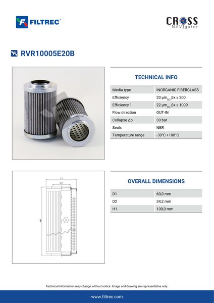 Genuine Filtrec RVR10005E20B. This Filtrec element is designed to meet or exceed the quality and performance of brand OEM’s ensuring superior filtration performance and long-lasting durability.