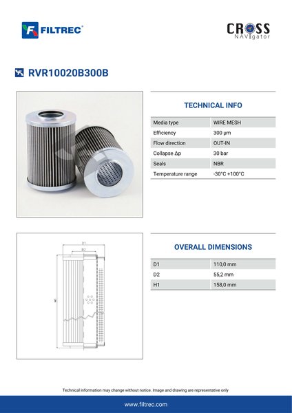 Genuine Filtrec RVR10020B300B. This Filtrec element is designed to meet or exceed the quality and performance of brand OEM’s ensuring superior filtration performance and long-lasting durability.Engineered with their high performance media and a durable design, the RVR10020B300B provides reliable and consistent performance over its lifespan, even in harsh operating environments. When you order from FilterFinder, you can trust that you are getting a reliable and high-quality replacement filter that will keep your system running smoothly.