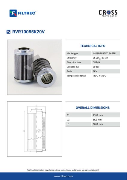 Genuine Filtrec RVR10055K20V. This Filtrec element is designed to meet or exceed the quality and performance of brand OEM’s ensuring superior filtration performance and long-lasting durability.Engineered with their high performance media and a durable design, the RVR10055K20V provides reliable and consistent performance over its lifespan, even in harsh operating environments. When you order from FilterFinder, you can trust that you are getting a reliable and high-quality replacement filter that will keep your system running smoothly.